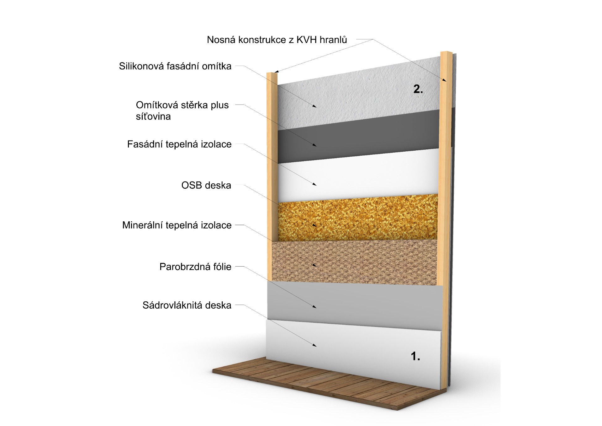 Skladba, konstrukce obvodových stěn a stropu: pozice 1. možnosti vnitřního dekoru - sádrokartonové desky, obklad z dřevěných palubek,