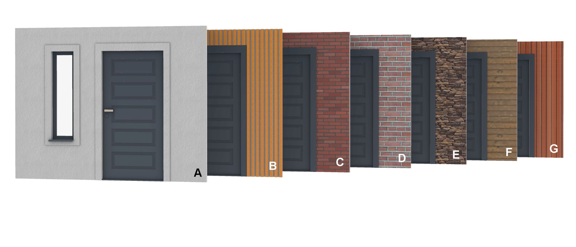A. Silikonová fasádní barevná omítka B. Silikonová fasádní barevná omítka s dřevěným obkladem C. Obložení v dekoru cihla D. Obložení v dekoru cihla - anglická vazba E. Obložení v dekoru kámen F. Obklad z dřevěných palubek horizontálně G. Obklad z dřevěných palubek vertikálně